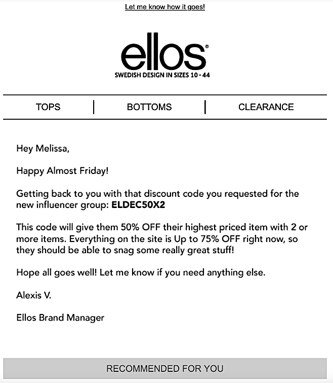 At first glance this looks effective. A hallmark of influencer marketing is being able to share VIP deals with your audience, which builds up your following. And the language is definitely conversational. It sounds as if someone with a healthy Insta or TikTok following asked for a favor and was granted one.