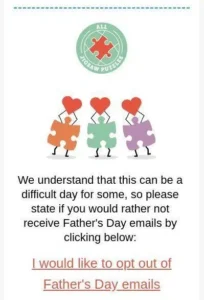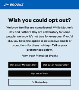 This trend began in the U.K. in 2019 when florist Bloom & Wild sent a simple email with the subject line “Want to opt out of Mother’s Day emails? No problem.” The company also allows customers to opt out of Father’s Day and Grandparent’s Day emails.